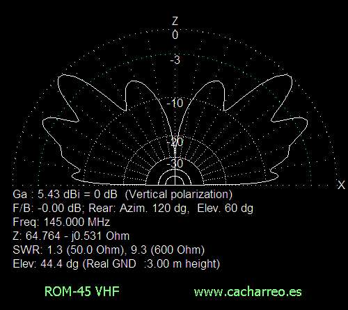 La ROM-45 está pensada para trabajar con un patrón de radiación dominante próximo a los 45º de elevación. El lóbulo de salida principal podemos desplazarlo desde unos 33 hasta 56 grados, variando la altura de la antena sobre suelo entre los 0,75 y los 1,25 metros. Esta distancia al suelo (rondando la 1/2 onda) es la mas crítica. Por encima de ahí el diagrama de radiación preferente se sitúa alrededor de los 45º y apenas se modifica en todo el ancho de banda de la antena conforme vamos aumentando su altura sobre el suelo.